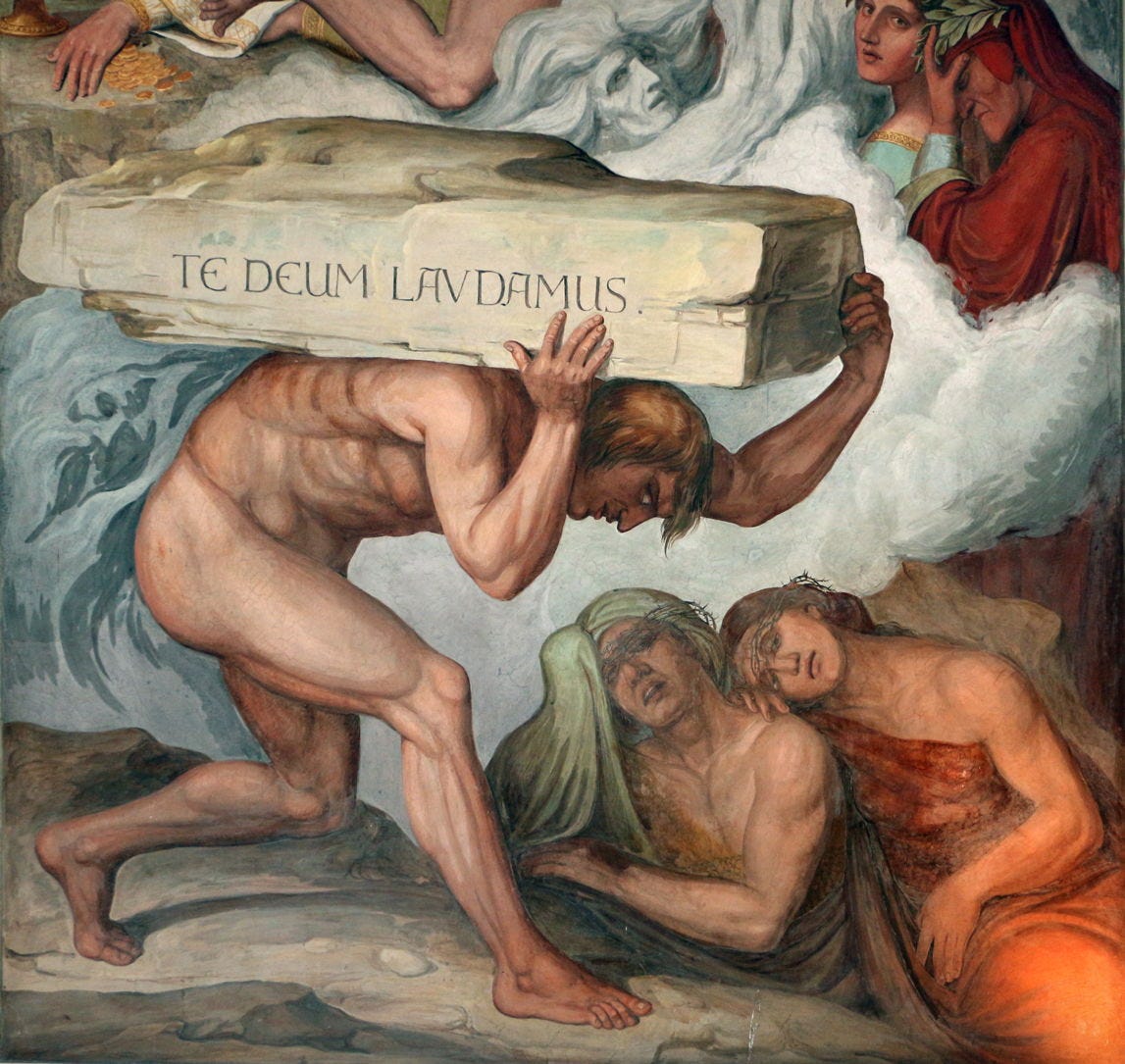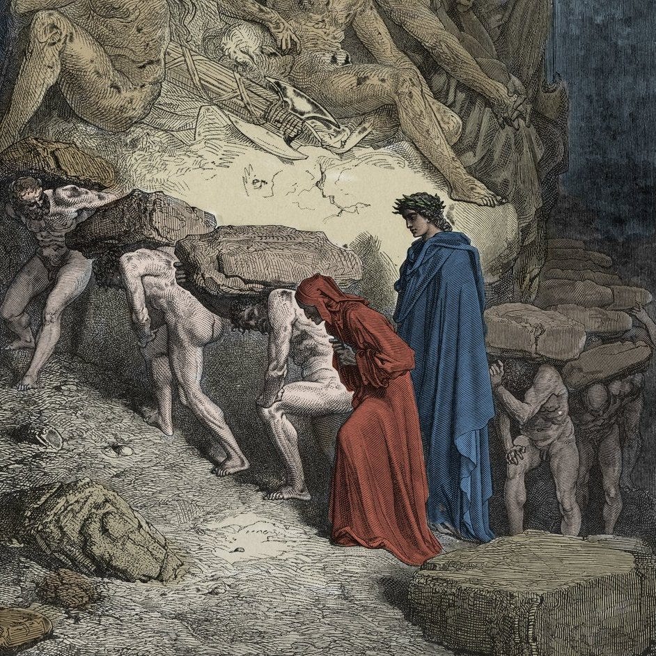 For instance, in the terrace of Pride, sinners must carry heavy boulders while hunched over, which teaches them humility.