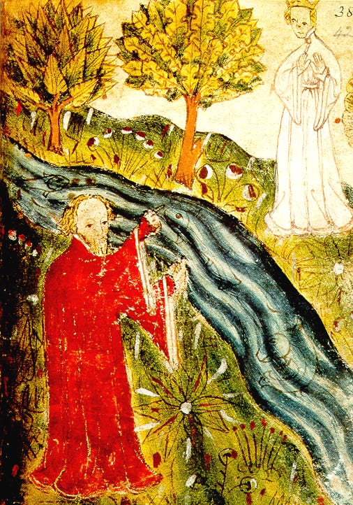 He ventures deeper into this garden, and from across the stream he sees an appearance that makes his heart stop: