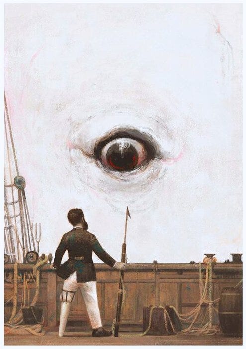 “The White Whale swam before [Ahab’s mind] as the monomaniac incarnation of all those malicious agencies which some deep men feel eating in them, till they are left living on with half a heart and half a lung… All that most maddens and torments; all that cracks the sinews and cakes the brain; all the subtle demonisms of life and thought; all evil, to crazy Ahab, were visibly personified, and made practically assailable in Moby Dick. He piled upon the whale’s white hump the sum of all the general rage and hate felt by his whole race from Adam down”