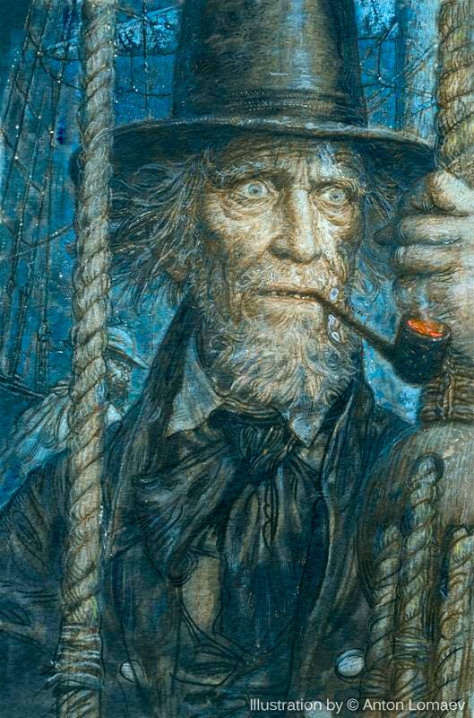 Captain Ahab is the ship’s infamous leader. He’s described as a grizzled older man with the hardened facial features of a long-suffering, vengeful spirit. Most strikingly, he hobbles around on a peg leg, because a great white whale named Moby Dick ate his leg.